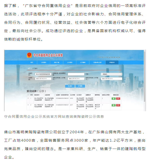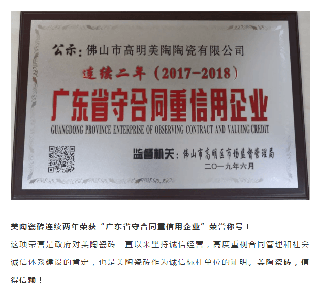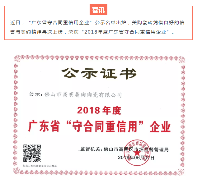 以誠信 贏贊譽丨美陶瓷磚榮獲“廣東省守合同重信用企業(yè)”
