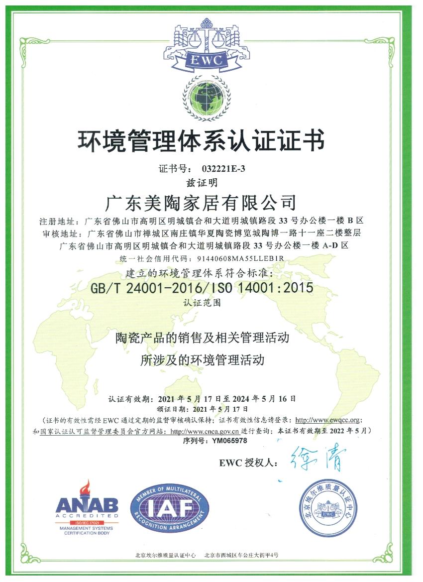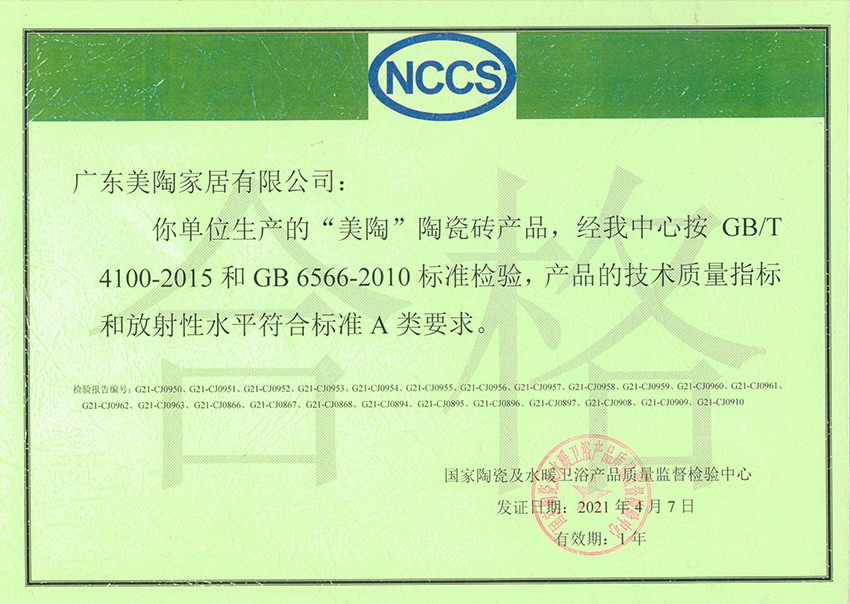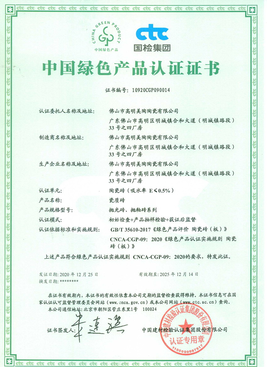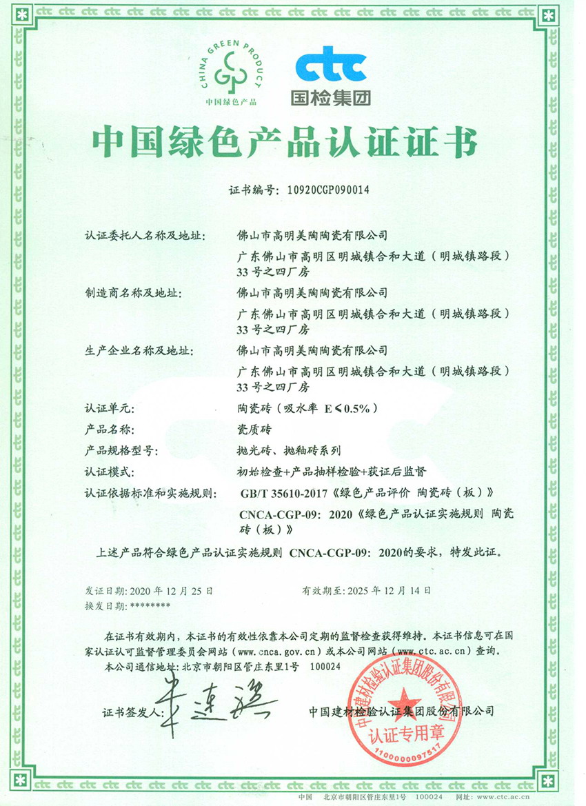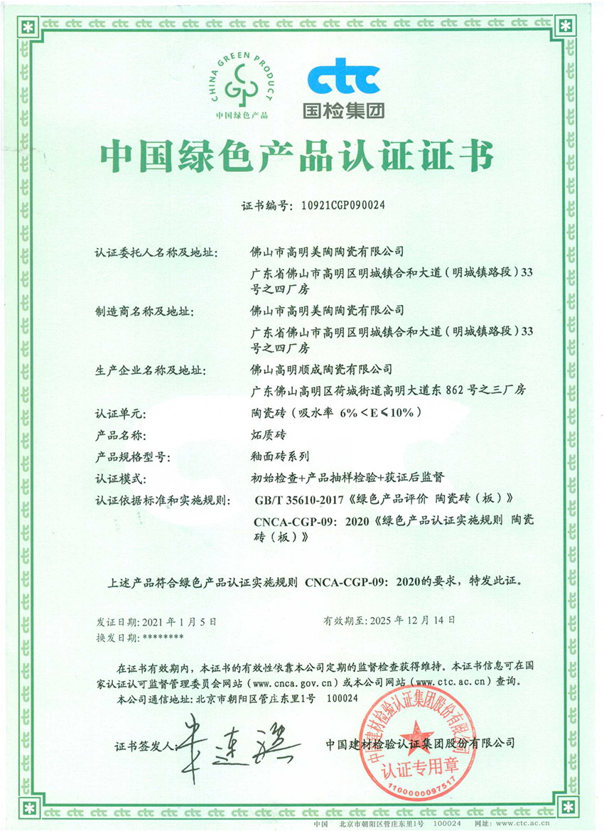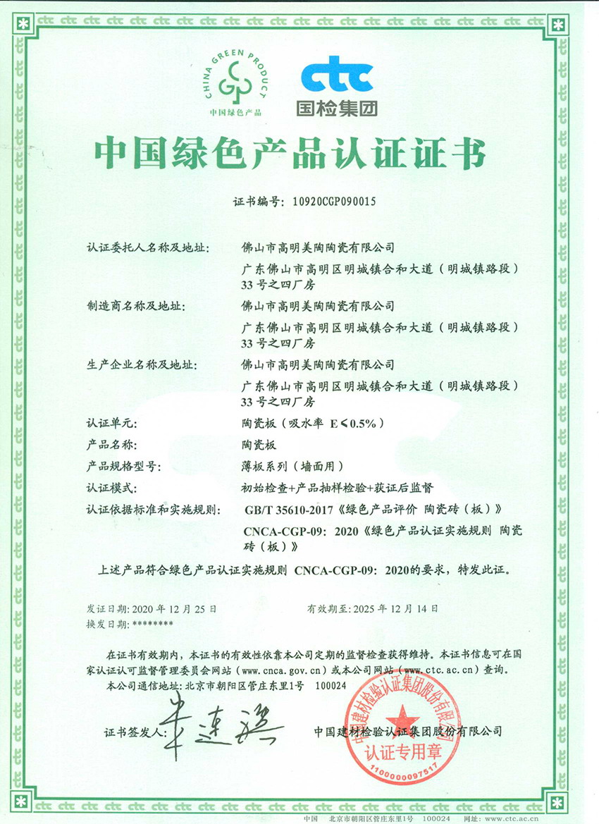 中國綠色產(chǎn)品認證證書【陶瓷板】