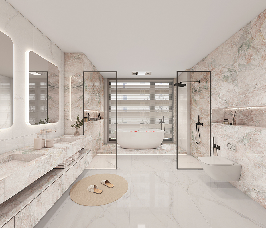靈感源自四季粉奢石 以時光釉+AI復刻技術(shù),1:1復刻天然奢石肌理 精雕工藝讓紋理自然下陷,指尖可觸真石起伏 整體粉調(diào)為主,綠、金紋理相間其中 如晨曦映上花瓣般輕柔漫開,夢幻多變 自帶仙氣,賦予空間浪漫綺麗的輕奢感